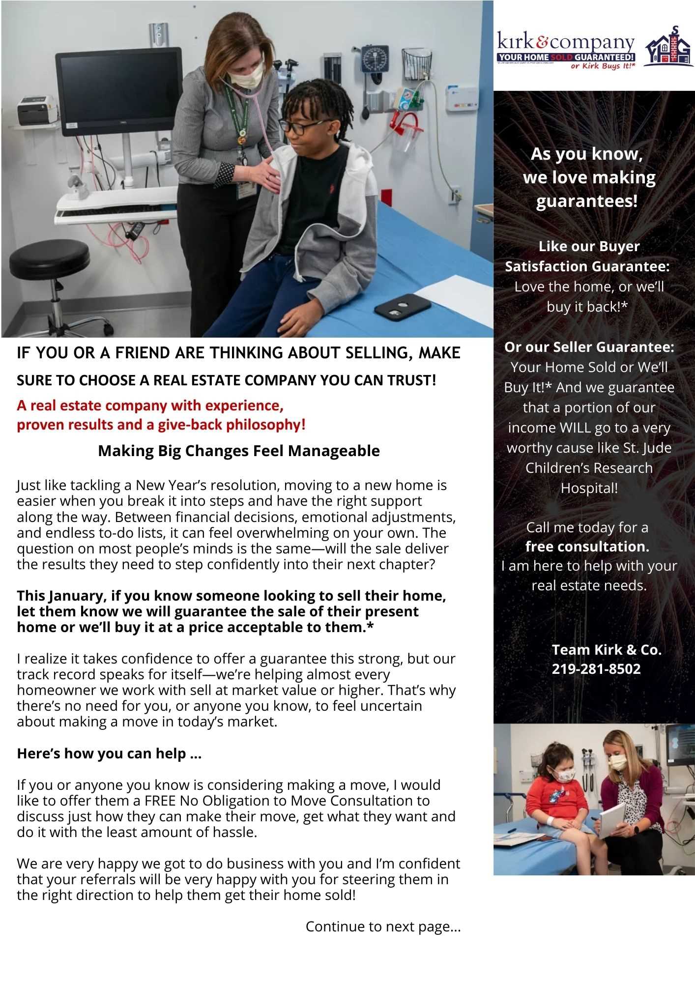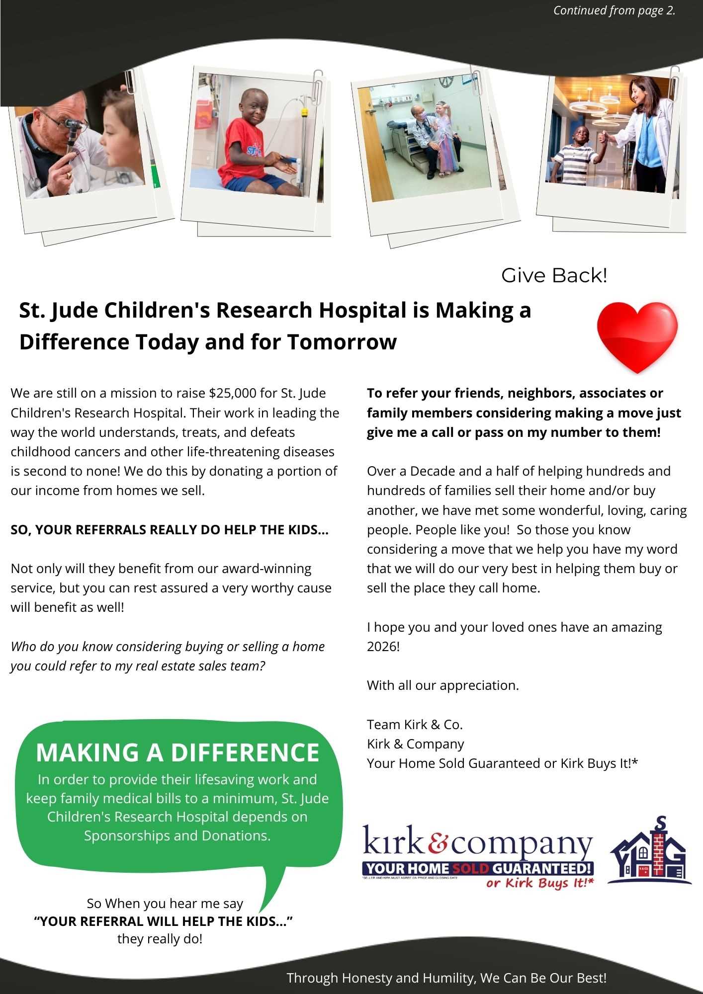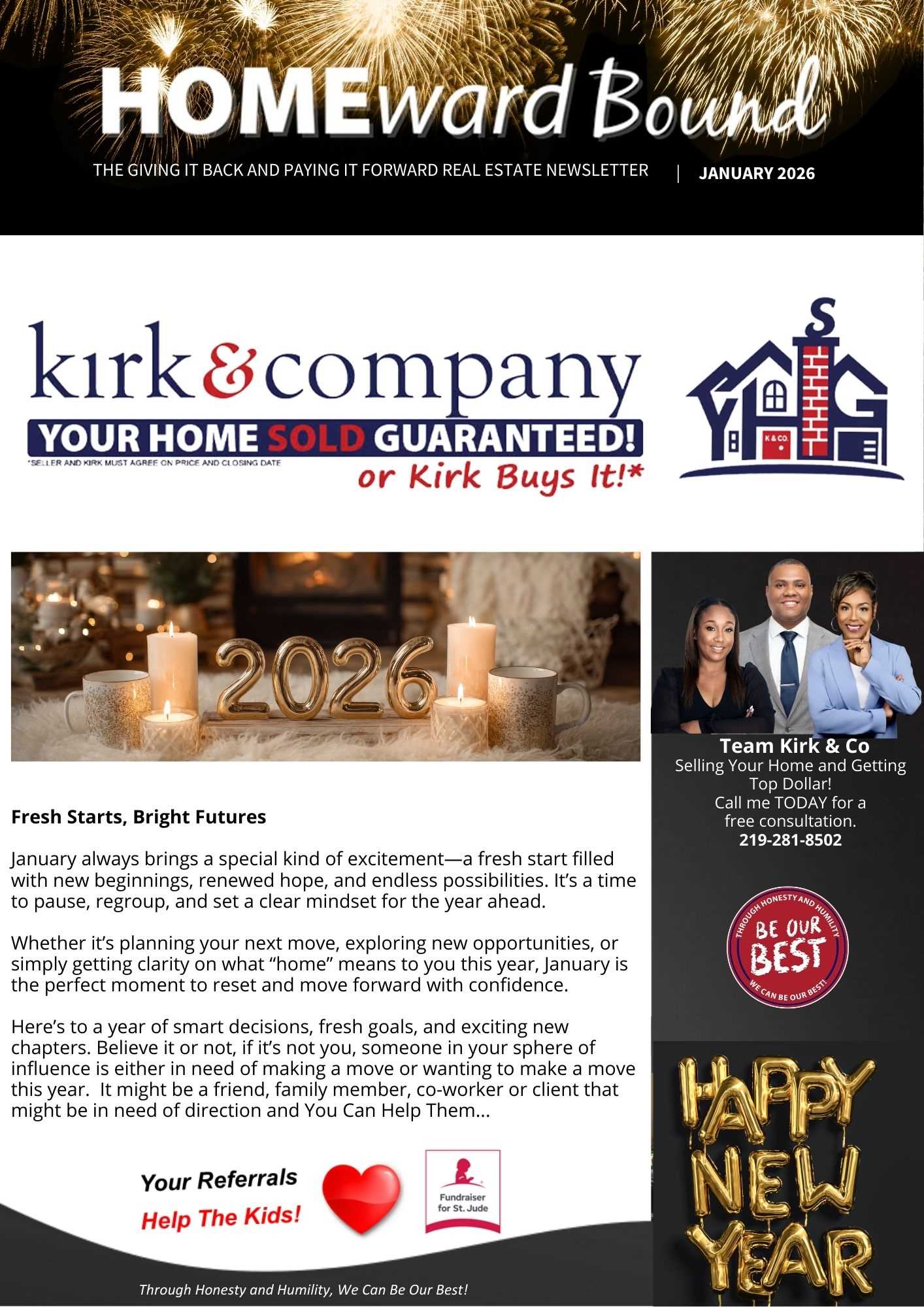 January 2026 - Happy New Year!Fresh Starts, Bright Futures January always brings a special kind of excitement—a fresh start filled with new beginnings, renewed hope, and endless possibilities. It’s a time to pause, regroup, and set a clear mindset for the year ahead. Whether it’s planning your next move, exploring new opportunities, or simply getting clarity on what “home” means to you this year, January is the perfect moment to reset and move forward with confidence. Here’s to a year of smart decisions, fresh goals, and exciting new chapters. Believe it or not, if it’s not you, someone in your sphere of influence is either in need of making a move or wanting to make a move this year. It might be a friend, family member, co-worker or client that might be in need of direction and You Can Help Them... SO, YOUR REFERRALS REALLY DO HELP THE KIDS… Not only will they benefit from our award-winning service, but you can rest assured a very worthy cause will benefit as well!